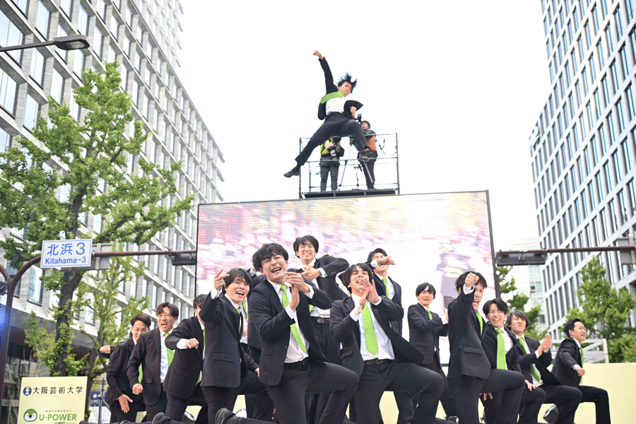 今話題沸騰中の現役サラリーマンによる男子チアパフォーマンス集団「チアリーマンズ」、BMXフリースタイルパーク全日本選手権優勝者を含むBMX選手によるライダーパフォーマンス、フラッグパフォーマーの方々と当社社員20名のフラッグ隊が並び、総勢約60名が一度限りのコラボレーションを披露しました。