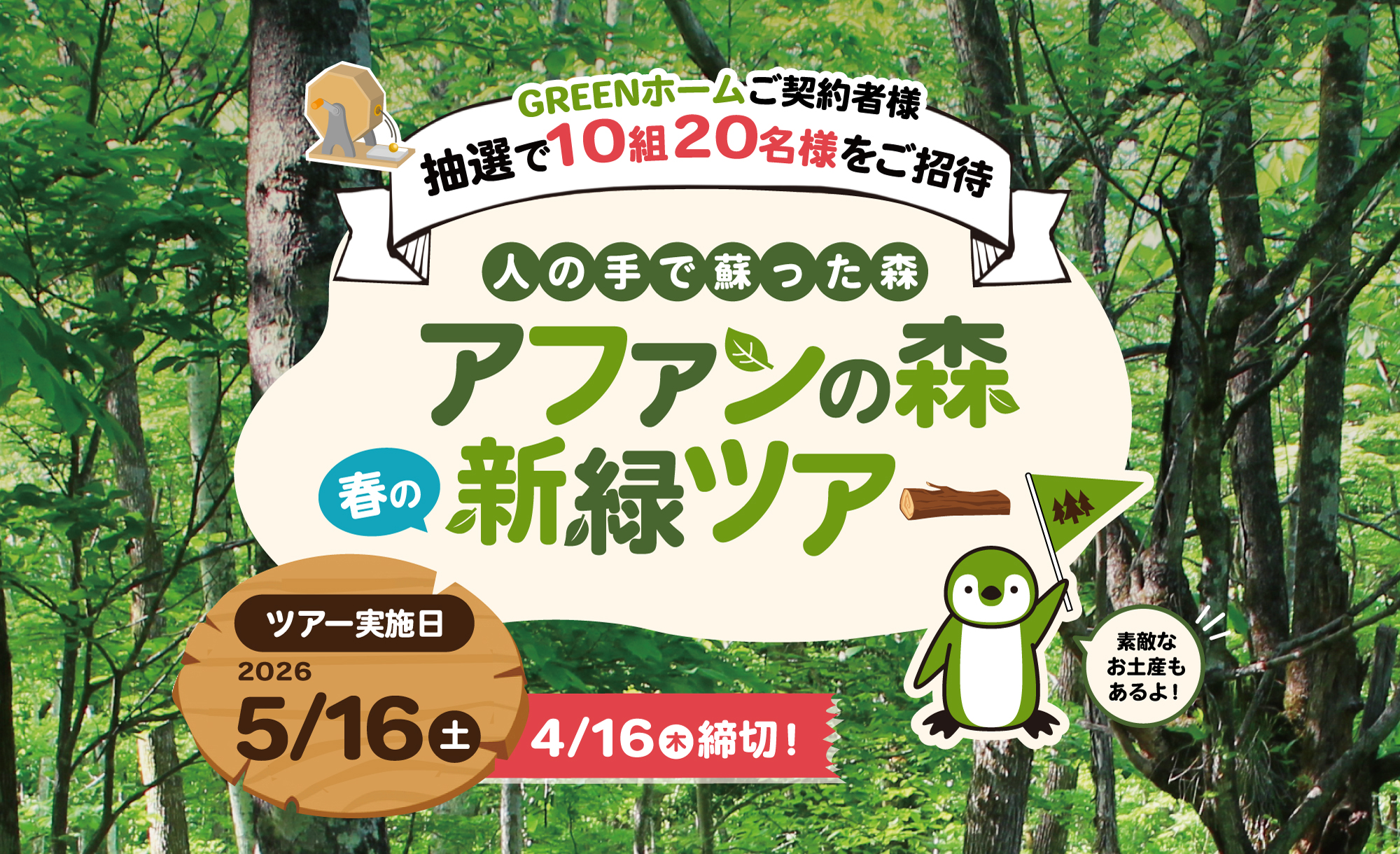 【ご招待企画】家庭向けプラン「GREENホーム」ご契約者様限定 2026年春 アファンの森ツアープレゼント