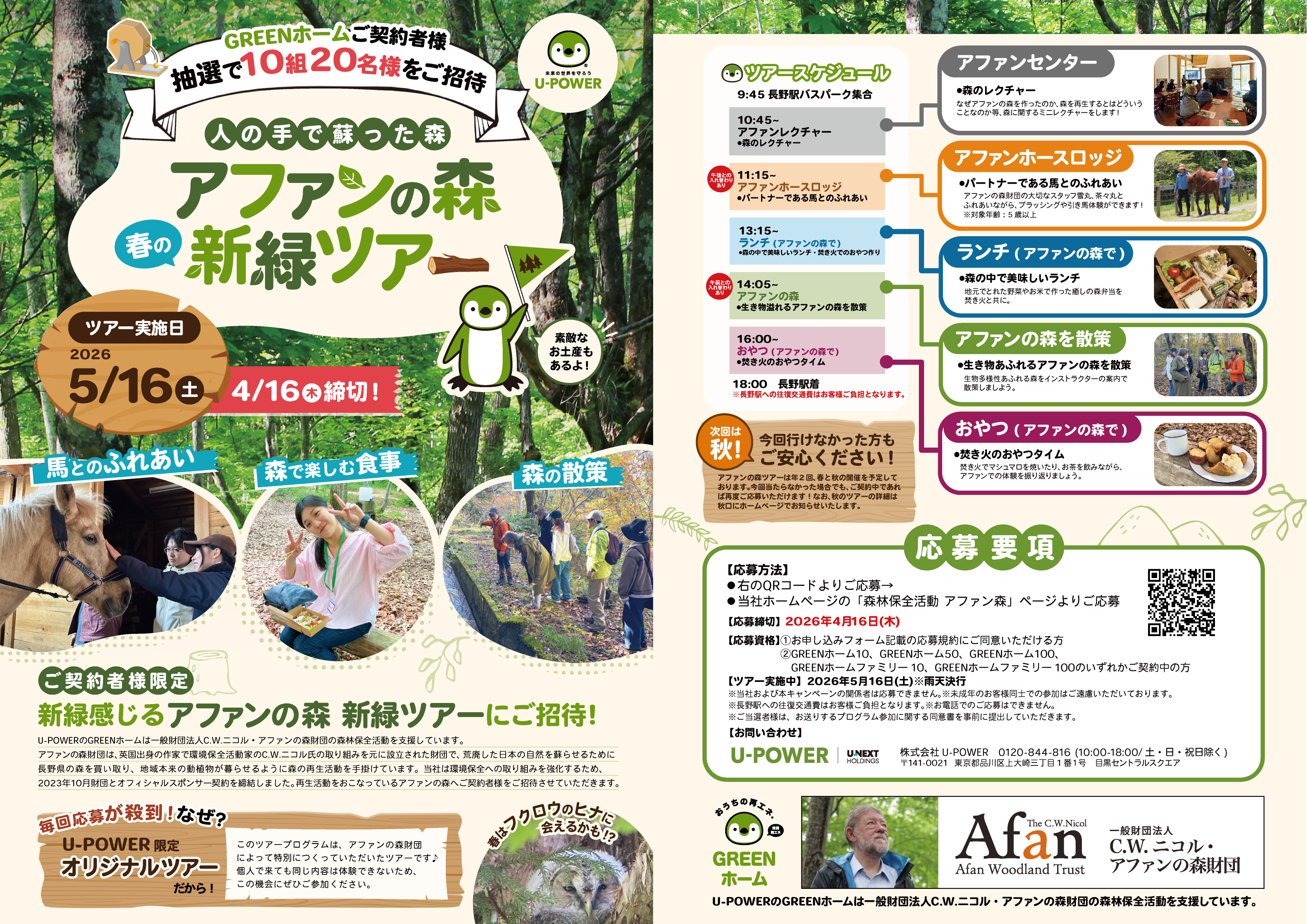 今回、アファンの森財団との取り組みのひとつとして、U-POWERの家庭用プラン「GREENホーム」をご契約のお客さま限定で、ご応募いただいた方の中から10組20名を、アファンの森ツアーに無料でご招待します。ツアーでは、アファンの森の散策や、馬とのふれあい、焚き火でのおやつ作りなど、様々なアクティビティをご用意しております。この機会にぜひ、人の手で甦った生きもの溢れる森を体験ください。